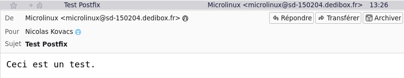 Ldfa Posté(e) il y a 4 heures Posté(e) il y a 4 heures www.microlinux.fr microlinux.fr Environ 5 minutes de lecture Debian serveur Postfix est un serveur mail, et plus exactement un MTA (Mail Transfer Agent). Il gère l'envoi et la réception de mails par Internet en utilisant le protocole SMTP. Le monde de l'Open Source offre toute une panoplie de MTA, parmi lesquels on trouve Postfix, Exim, Qmail et Sendmail. Dans ce premier article sur les serveurs de messagerie, nous allons configurer Postfix sur une machine publique tournant sous Debian 13 Trixie. Notre premier objectif, ce sera l'envoi des messages du système comme par exemple les notifications du système de sauvegardes automatiques Rsnapshot. Prérequis Avant de mettre la main à la pâte, je vérifie si le serveur n'est pas blacklisté quelque part : https://mxtoolbox.com/blacklists.aspx Installation Postfix est fourni par les dépôts officiels de la distribution : $ sudo apt update $ sudo apt install --no-install-recommends postfix Choisissez No configuration dans la fenêtre de configuration post-installation : On installera également la commande mail (paquet bsd-mailx) pour pouvoir tester et gérer les mails en ligne de commande directement sur le serveur : $ sudo apt install bsd-mailx Configurer Postfix Les fichiers de configuration utilisés par Postfix se situent dans /etc/postfix : Le fichier master.cf gère la configuration du démon master de Postfix. Dans la plupart des configurations de base, on n'aura pas à intervenir sur ce fichier. Le fichier main.cf contient les paramètres de contrôle des démons de Postfix. C'est celui que l'on modifiera le plus souvent. Étant donné que nous avons opté pour No configuration lors de l'installation, nous disposons uniquement d'un fichier main.cf.proto censé servir de base pour une configuration personnalisée. Le fichier /etc/postfix/main.cf.proto est une copie exacte du fichier /usr/share/postfix/main.cf.debian. En dehors de cela, le répertoire /usr/share/postfix/ fournit un fichier main.cf.dist amplement documenté qui décrit en détail le rôle de chacune des directives de configuration de Postfix. Si un paramètre n'est pas présent dans main.cf, Postfix utilisera sa valeur par défaut. Pour la plupart, ces valeurs sont définies en dur dans le code source de Postfix, tandis que certaines sont initialisées à la compilation et quelques-unes au moment du lancement du programme. Voici une configuration de mon cru pour envoyer des e-mails depuis une machine publique avec une ouverture frontale sur Internet : /etc/postfix/main.cf # /etc/postfix/main.cf # # Minimal Postfix configuration for Internet-facing servers # Disable backwards compatibility compatibility_level = 3.10 # Dedicated Postfix user mail_owner = postfix # Disable IPv6 inet_protocols = ipv4 # Outbound mail only inet_interfaces = localhost mailbox_size_limit = 0 # Host myhostname = sd-150204.dedibox.fr # Domain mydomain = dedibox.fr # Authorize local machine only mynetworks = 127.0.0.1/32 # Local aliasing alias_maps = hash:/etc/aliases # Debugging debugger_command = PATH=/bin:/usr/bin:/usr/local/bin:/usr/X11R6/bin ddd $daemon_directory/$process_name $process_id & sleep 5 Le programme postconf est très utile pour examiner les valeurs courantes et par défaut du fichier main.cf. Pour afficher la valeurs de certains paramètres de configuration, il suffit de les fournir en argument : $ sudo postconf inet_interfaces inet_interfaces = localhost L'option -d affichera la valeur par défaut des paramètres demandés : $ sudo postconf -d inet_interfaces inet_interfaces = all Servez-vous de postconf à tire-larigot N'hésitez pas à tester chacune des directives de main.cf avec postconf pour retenir les directives qui ne vont pas correspondre à la valeur définie par défaut : $ sudo postconf inet_protocols inet_protocols = ipv4 $ sudo postconf -d inet_protocols inet_protocols = all La configuration que je vous ai fournie en exemple mérite quelques remarques : Si l'IPv6 est désactivé au niveau du système, il faudra également le faire ici grâce à la directive inet_protocols. inet_interfaces = localhost limite l'utilisation de Postfix aux applications locales. myhostname est censé contenir le nom d'hôte pleinement qualifié du serveur, c'est-à-dire le résultat de la commande hostname --fqdn. mynetworks définit les adresses depuis lesquelles Postfix accepte les mails sans authentification via SMTP. alias_maps définit l'emplacement de la table de correspondance. Certaines informations ne peuvent pas être facilement représentées dans main.cf. Les tables de correspondance permettent de les stocker dans des fichiers externes. Postfix n'utilise pas directement les fichiers texte, ce serait trop lent. Au lieu de cela, les tables de correspondance de type hash (ou « tables de hachage ») servent pour construire des fichiers indexés, grâce à la bibliothèque Berkeley DB. Le programme postmap est utilisé pour construire les fichiers indexés. Pour mettre à jour les alias, on utilisera la commande newaliases. Créez la table de correspondance /etc/aliases : /etc/aliases # /etc/aliases postmaster: root root: info@microlinux.fr Indiquez votre adresse e-mail Je vous encourage fortement à utiliser votre adresse e-mail plutôt que la mienne. Ceci étant dit, la quantité de notifications que je reçois quotidiennement par e-mail me donne une vague idée de la popularité de mes articles sur l'administration des serveurs Linux. Construisez le fichier indexé : $ sudo newaliases Cette commande va créer un fichier /etc/aliases.db exploitable par Postfix : $ ls -l /etc/aliases* -rw-r--r-- 1 root root 65 Jan 31 13:17 /etc/aliases -rw-r--r-- 1 root root 12288 Jan 31 13:16 /etc/aliases.db Mise en service Le service postfix est activé dans la configuration par défaut. Il me suffit de le démarrer : $ sudo systemctl start postfix Je vérifie si Postfix tourne correctement : $ systemctl status postfix ● postfix.