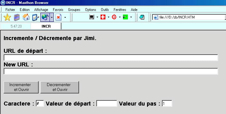 Jimi Posté(e) le 9 juin 2005 Posté(e) le 9 juin 2005 Ca a failli etre un plugin, ca ressemble a un plugin , ca remplace avantageusement certains plugins ! Mais apres essais , je le livre comme un simple script a executer dans Maxthon. PRESENTATION Ce script vous incrementera ou decrementera une valeur placée n'importe ou dans une adresse et ouvrira cette nouvelle adresse dans un nouvel onglet. Ceci a volonté. Un fichier tedte est fourni dans le zip, pour une presentation plus detaillée et le fonctionement , installation. Pour la petite histoire , je l'avais deja crée ya qq temps, et supprimé par erreur, Argll. Je l'ai refait en mieux , plus elaboré. Notament pour la prise en compte de valeur numerique de type 0001 , dans ma premiere version je devait ignorer les zero et rempacer seulemnt la valeur , et ensuite reediter pour le passage a 10 a 100 etc . Now il gere tres bien ca. Pour l'instant il ne focntionne que dans Maxthon et IE , avec le desagrement pour ce dernier , d'ouvrir une nouvelle fenetre et d'activer celle ci ==> galere. Actuellement il ne Fonctionne pas dans Firefox, mais j'y travaille .... Il y aura surement de la mise a jour, j'ai imaginé des ameliorations possible, et comme d'hab, suggestions bienvenues ... Bonne exploration ! INCR.ZIP