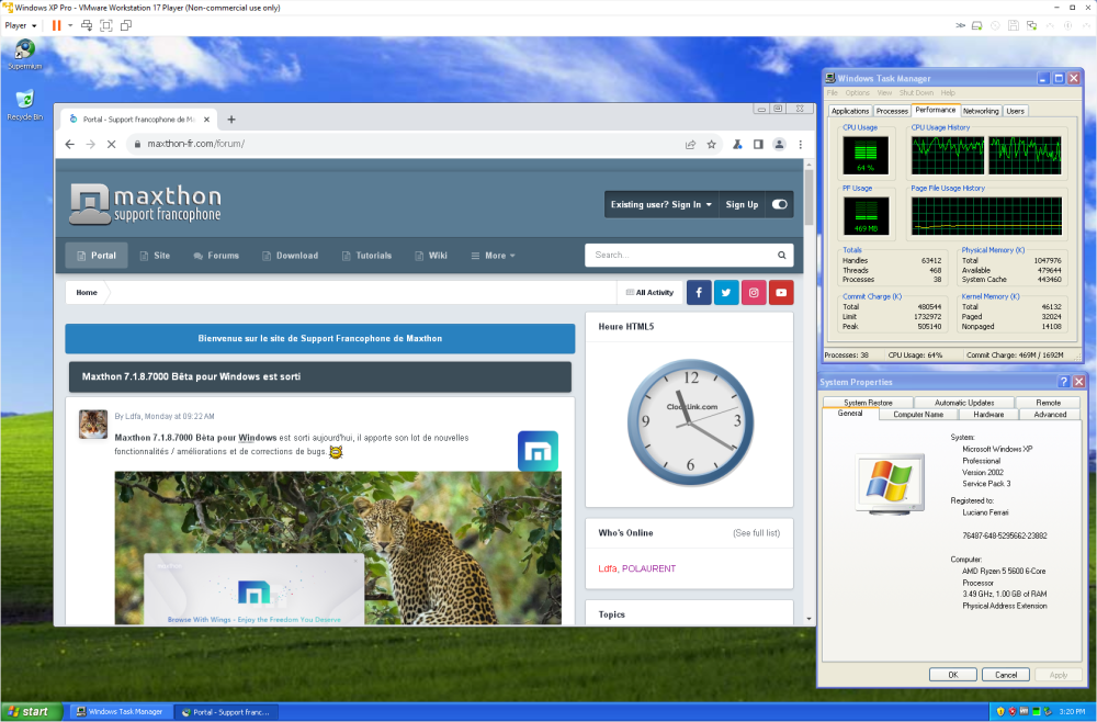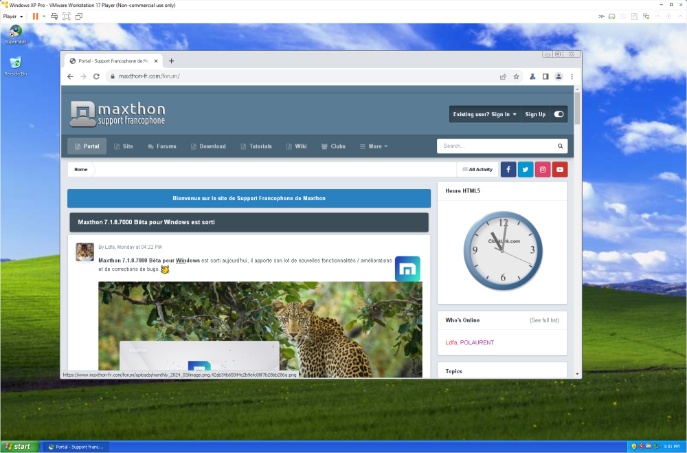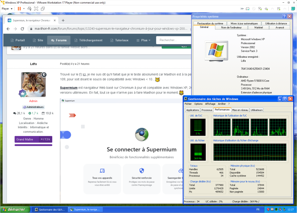 Avec 4 CPU configurés et l'utilisation du GPU désactivée dans les paramètres de Supermium, ça reste utilisable. la dernière version de Maxthon ne s'installe pas sur Windows XP. -