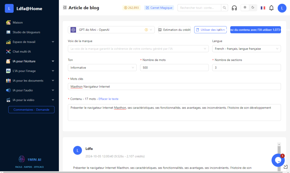 Je viens de découvrir 1minAI grâce cet l'article de 01net et j'ai eu envie de tester cet outil avant d'investir, même si celui-ci reste très abordable avec l'offre actuelle à vie indiquée dans l'article. On peut tester gratuite 1minAI, je me suis donc inscrit et lancé dans l'aventure. Voici l'interface proposée par 1minAI : On peut générer des textes, des images, des documents, de l'audio et de la vidéo. La version gratuite est limitée par un nombre de crédits maximum attribué par mois. A l'inscription, j'ai obtenu 265000 crédits. On a l'estimation du coût en crédit de chaque utilisation, en fonction de l'IA sélectionnée et du type de contenu généré. Pour tester, j'ai demandé de à ChatGPT-4o Mini de me générer un article de présentation de Maxthon : Maxthon : L'art de naviguer avec un navigateur innovant Introduction : Un Voyage dans l'Univers du Maxthon Navigateur Internet Le monde numérique offre une multitude de navigateurs internet, chacun avec ses propres caractéristiques. Parmi eux, le Maxthon Navigateur Internet se distingue par son interface utilisateur intuitive et ses fonctionnalités avancées. Initialement lancé en 2002, Maxthon a évolué pour répondre aux besoins variés des utilisateurs modernes, tout en proposant une expérience de navigation fluide. Au fil des années, Maxthon a intégré des technologies innovantes pour améliorer la vitesse de navigation et l’efficacité énergétique, rendant ainsi son utilisation agréable non seulement pour les professionnels, mais aussi pour les utilisateurs ordinaires. Dans cet article, nous allons explorer ses caractéristiques, ses avantages et ses inconvénients, ainsi que son histoire fascinante. Caractéristiques et Fonctionnalités Exceptionnelles de Maxthon Le Maxthon Navigateur Internet offre une gamme impressionnante de fonctionnalités qui répondent aux besoins divers de ses utilisateurs. L'un des aspects les plus notables est son moteur de rendu double, qui permet aux utilisateurs de choisir entre le moteur Trident et le moteur WebKit. Cela assure une compatibilité optimale avec une multitude de sites internet. En outre, Maxthon propose un bloqueur de publicités intégré, permettant aux utilisateurs de naviguer sans interruption, tout en améliorant les temps de chargement des pages. Une autre caractéristique intéressante de Maxthon est le "Cloud Sync". Cette fonctionnalité permet aux utilisateurs de synchroniser leurs onglets, favoris et paramètres entre plusieurs appareils. Que vous utilisiez un ordinateur, une tablette ou un smartphone, vous pouvez continuer votre navigation sans interruption. En ajoutant à cela un gestionnaire de téléchargement optimisé et un mode de lecture simplifié, Maxthon se positionne comme une option incontournable pour les utilisateurs à la recherche d’efficacité. Avantages et Inconvénients de Maxthon Chaque navigateur a ses forces et ses faiblesses, et Maxthon ne fait pas exception. Parmi ses avantages, on trouve sa rapidité d'exécution et ses fonctionnalités uniques comme le mode nuit, qui réduit la luminosité de l'écran pour une utilisation plus confortable dans des environnements sombres. De plus, son interface personnalisable permet aux utilisateurs de créer un espace de travail qui leur convient, rendant la navigation encore plus agréable. Cependant, il est également important de mentionner certains inconvénients. Même si Maxthon est riche en fonctionnalités, certains utilisateurs ont signalé des problèmes de sécurité. Des inquiétudes concernant la confidentialité des données et le stockage de ces dernières sur le cloud ont été soulevées, ce qui pourrait dissuader certains potentiels utilisateurs. De plus, bien que le navigateur ait une communauté active, il peut ne pas couvrir autant de problèmes ou de demandes que d’autres navigateurs plus populaires. L'Histoire de Maxthon et son Développement Maxthon a été fondé en 2002 par Jeff Chen sous le nom de "MyIE2". Rapidement, ce navigateur a gagné en popularité parmi les utilisateurs de Windows. En 2004, il a été rebaptisé Maxthon, ce qui a marqué le début d'une série d'améliorations et d'ajouts de fonctionnalités. Au fil des ans, l'entreprise a également développé des versions pour d'autres systèmes d'exploitation tels que Mac et Android, élargissant ainsi sa portée sur le marché. Les mises à jour régulières et l'engagement envers l'innovation ont permis à Maxthon de rester pertinent. En 2016, la version 5 a été publiée, intégrant des outils de sécurité avancés et une meilleure gestion des mots de passe. La capacité de Maxthon à évoluer tout en conservant ses utilisateurs fidèles démontre sa résilience dans un environnement de plus en plus compétitif. Conclusion En somme, le Maxthon Navigateur Internet offre une expérience de navigation riche en fonctionnalités et personnalisable. Bien qu'il présente des avantages indéniables, les utilisateurs doivent également considérer les préoccupations liées à la sécurité. Avec une histoire robuste de développement et de mise à jour, Maxthon continue d'être une option viable pour ceux qui cherchent à naviguer dans le monde numérique de manière efficace et agréable. Slug : maxthon-navigateur-internet-caracteristiques-avantages-inconvenients Meta Description : Découvrez le Maxthon Navigateur Internet : ses caractéristiques uniques, ses avantages et inconvénients, ainsi que son histoire fascinante depuis 2002. Le résultat est correct, sans rentrer dans les détails, ça reste un bon article de présentation de Maxthon pour monsieur tout le monde. Je vais essayer les autres IA sur le même sujet pour voir les différences. A bientôt pour la suite de ma découverte de 1minAI.